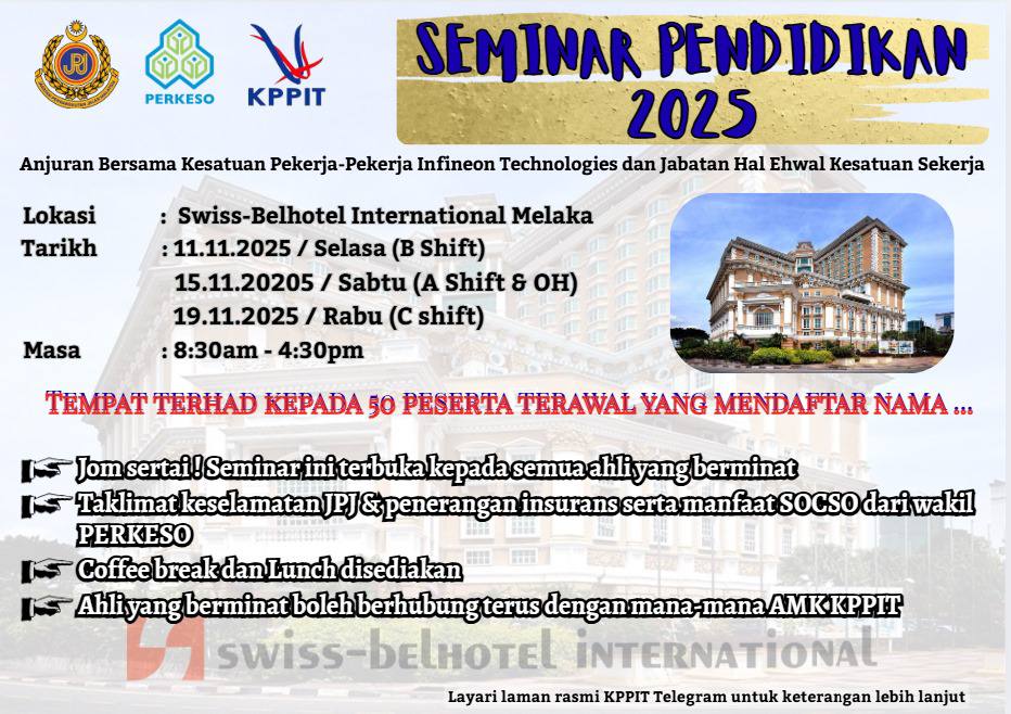 KPPIT bakal mengadakan Seminar Pendidikan untuk ahli seperti keterangan di atas. Jika berminat boleh menghubungi mana-mana AMK untuk mendaftar. Tempat terhad, 50 peserta terawal yang mendaftar nama bagi setiap sesi akan terpilih.
